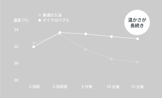 マイクロバブルの温浴効果を検証するため、普通のお湯とマイクロバブルを含むお湯(38℃)に5分間入浴し、その15分後に赤外線サーモグラフィで身体表面温度を比較。通常のお湯と比べて、約3℃の温度差があることが確認され、ぬるめのお湯でも体の芯から温まりやすいことがわかりました。