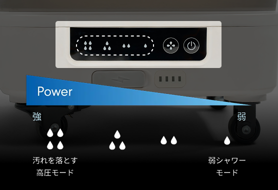 4段階の出力調整が可能な「インテリジェンスモードパネル」を搭載。用途や汚れの種類に合わせて最適な出力を簡単に選択できます。無駄な水や電力を抑え、環境にも優しい設計。