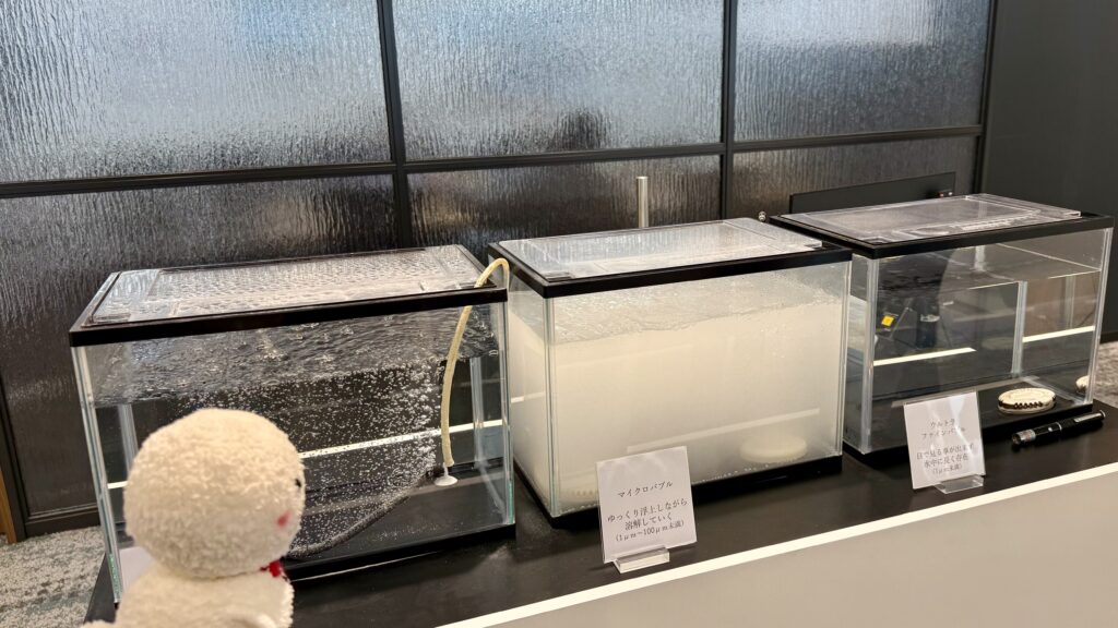 ミリバブル・マイクロバブル・ウルトラファインバブルの違いを、比較して見られる展示ゾーン。それぞれの泡のサイズや特性の違いを視覚的に理解でき、ミラバス技術の仕組みを分かりやすく紹介しています。