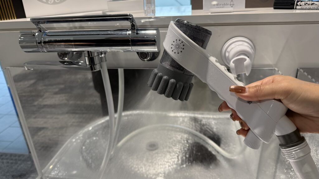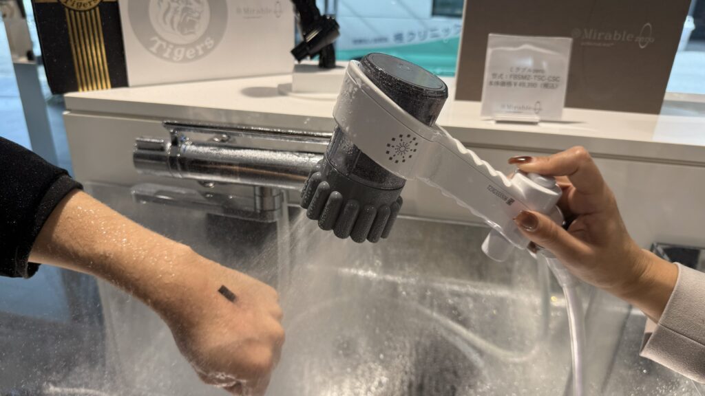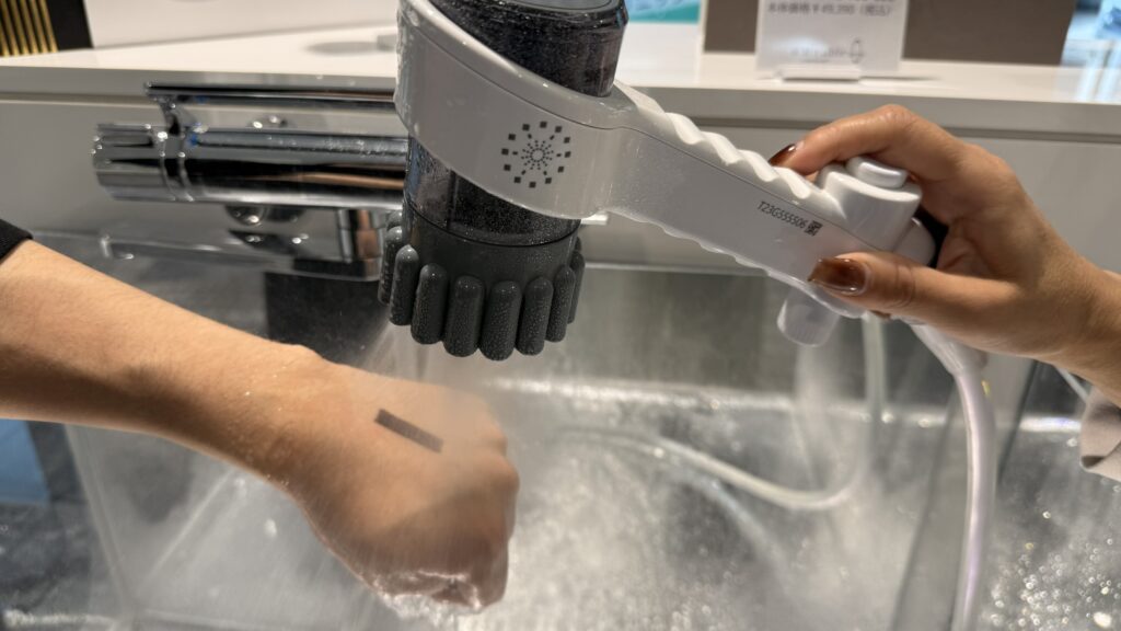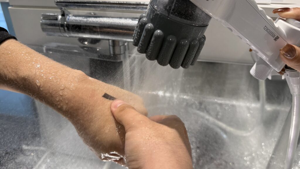 覚えていますか? 頬に油性ペンで線を引いてシャワーをあててこすると数秒で消える、インパクト抜群のCM。ショールームでは「ミラブルzero」のトルネードミストモードを使って、実際に手の甲でそれを体験できるのです。水と空気の力だけで汚れが落ちる瞬間は、目の前で見るとさらに驚きます。とても優しい力でこすっているにも関わらず、本当にきれいになりました!