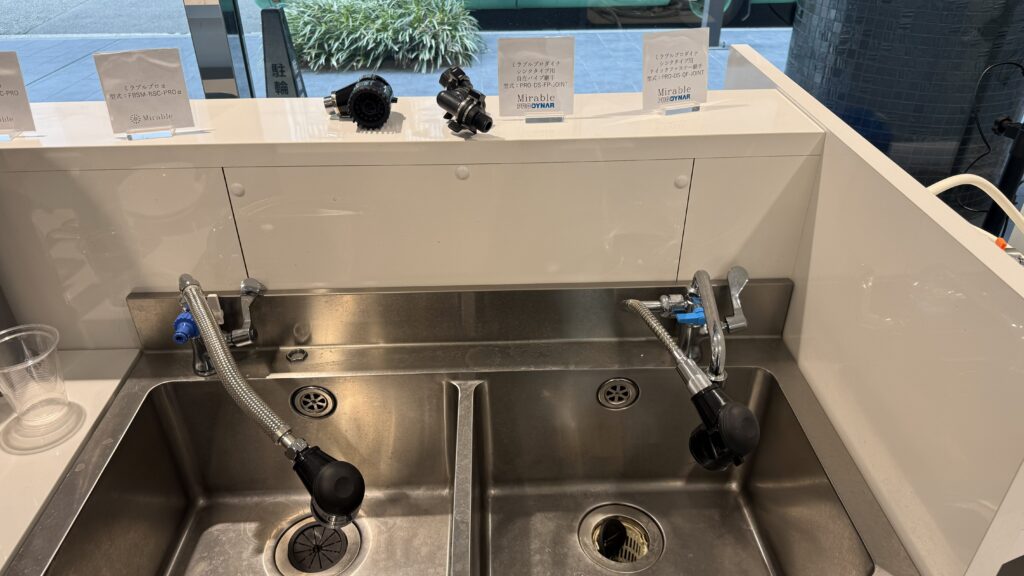 ショールームでは、飲食業界における厨房改善システム「ミラブルプロダイナー」も展示。ウルトラファインバブルによる油汚れの洗浄効率の良さを体感できます。