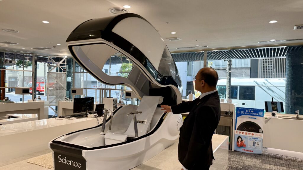 ショールームで、ひときわ目を引く「ミライ人間洗濯機」。2025年大阪・関西万博で1,277名が入浴体験した実物が設置してあります。取材時は展示のみでしたが、近く入浴体験も可能となる予定です。