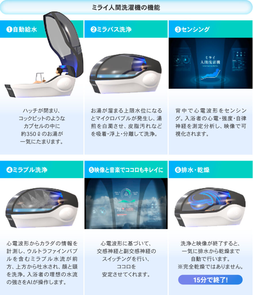 ファインバブル専業メーカーとして蓄積してきた技術力で、「心も体も洗う」をテーマに約1億円を投じて開発した「ミライ人間洗濯機」。コックピット型カプセルに、350リットルのお湯が一気に満たされ、マイクロバブルが発生。背中のセンサーが心電・心拍・自律神経をリアルタイムで測定し、そのデータをもとにウルトラファインバブルを含む「ミラブル水流」が吐水。AIが一人ひとりに最適な水流を自動調整します。心電波形に基づいて自律神経を整えるリラクゼーション機能を搭載し、排水から乾燥まで自動完了。1970年の夢をサイエンスの技術力で実現した「未来の入浴体験」が完成したのです。