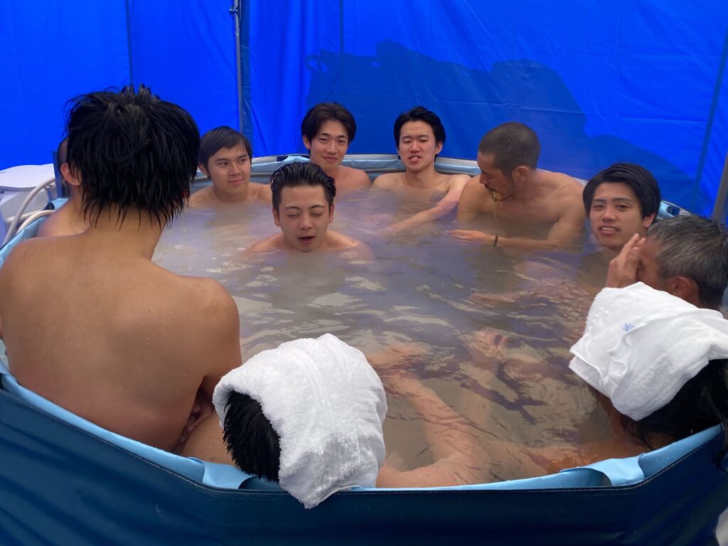「被災地用大浴場キット」の浴槽につかる参加者たちの表情は、疲れから笑顔へとすぐに変わっていました。