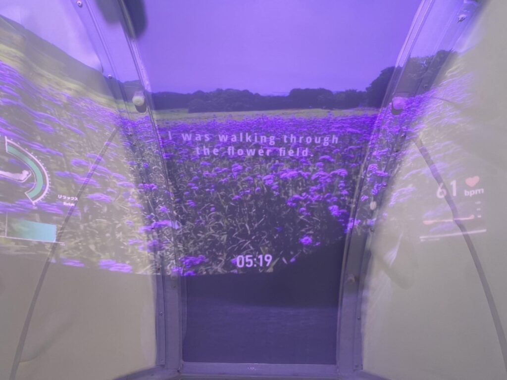 「洗濯」はカラダだけにとどまりません。入浴中、背中のセンサーが心拍を計測し、AIが心身の状態を分析。心地の良い音楽とともに、スクリーンには大自然が映り、気づけば春の草花の間を駆け抜けていました。