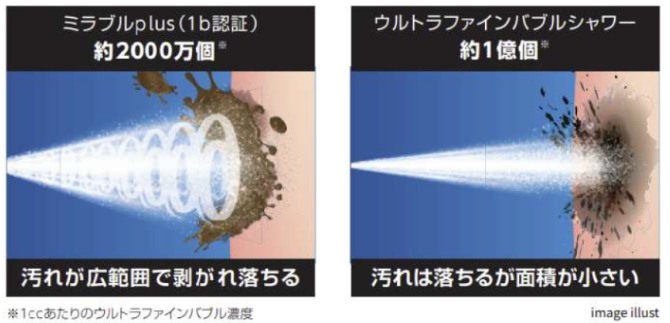「いえいえ、どちらの泡にもメリットがあるんですよ。例えばマイクロバブルは汚れをめくって持ち上げる界面活性のような働きをしますし、ウルトラファインバブルはつぶれにくい泡が水流に乗って、汚れを落とす研磨剤のような働きをしてくれます。気泡の大きさや個数だけに着目するのではなく、泡の大きさや水流をうまく組み合わせて、用途に応じて使いこなすことがポイントなんです」(平江)
